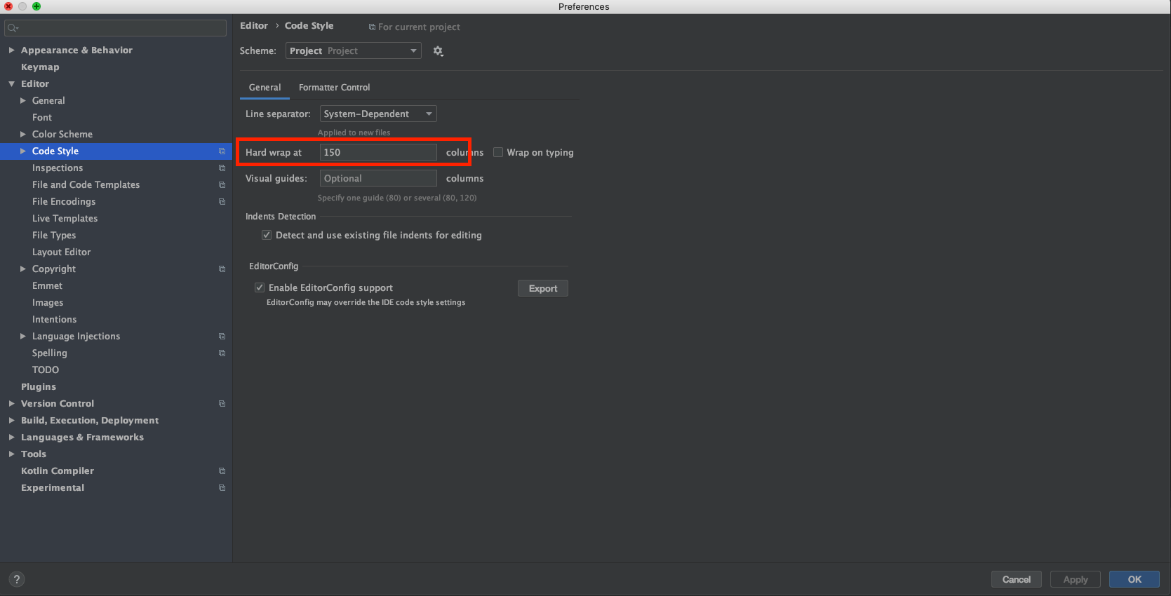 상단 메뉴 Android Studio Click -> Preferences -> Editer -> Code Style