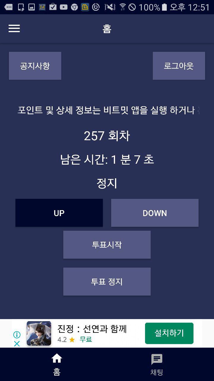 현재 회차 정보, 투표 진행 여부, UP, DOWN 선택 투표,