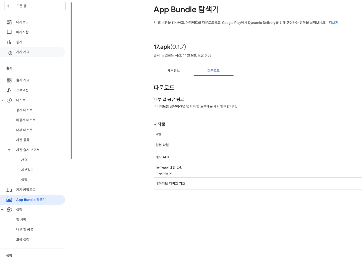 APK 파일 다운로드및 매핑파일 네이티브 디버그 기호 파일 업로드가 가능합니다.