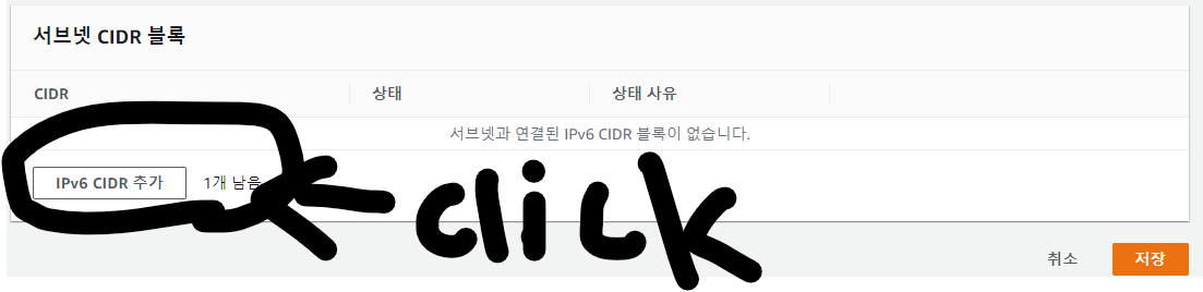 7. IPv6 CIDR 추가 클릭 -> 아무 숫자 2자리 입력 후 클릭 -> 저장