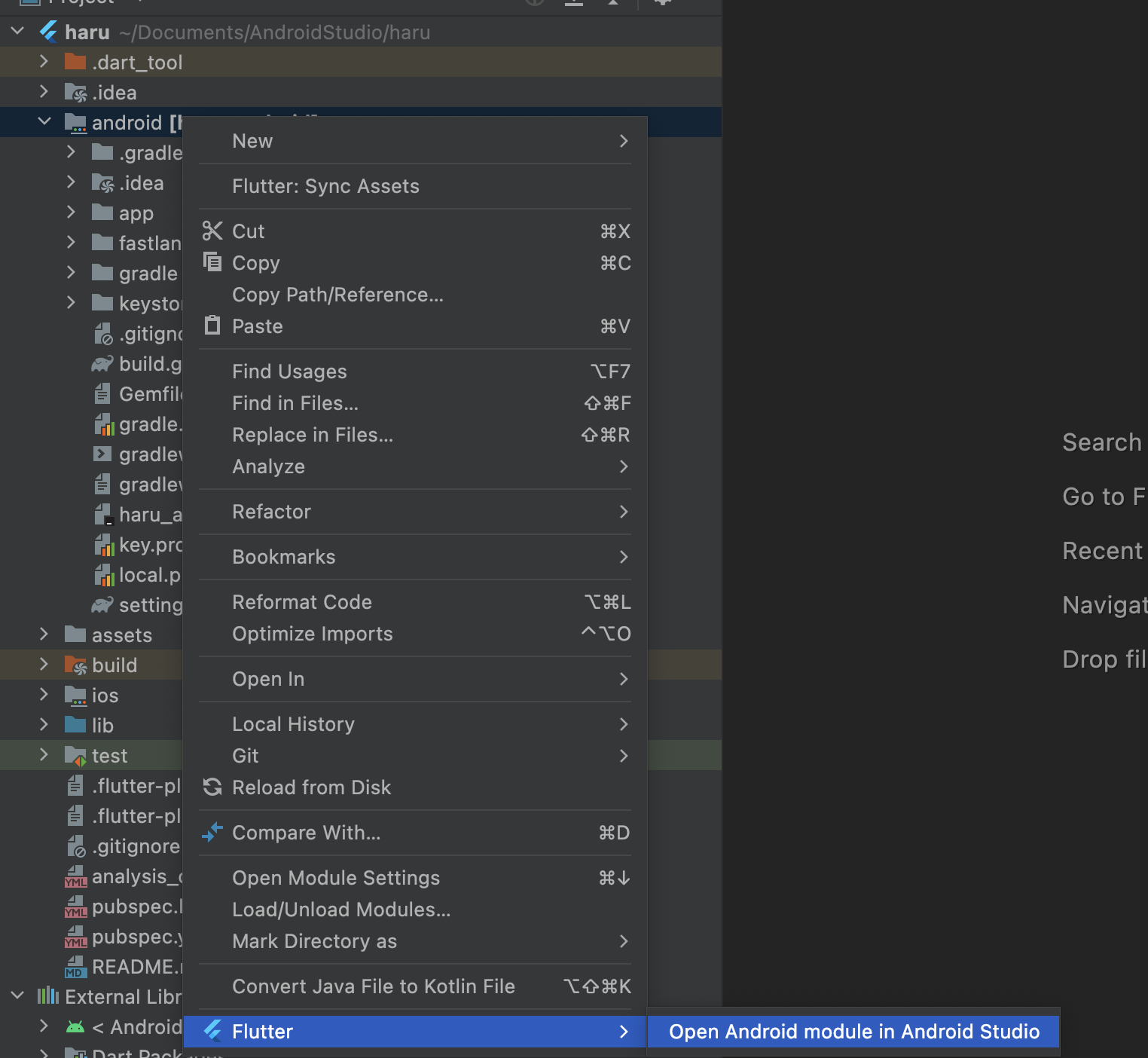 안드로이드 프로젝트에서 우측 클릭을 하고 Flutter -> Open Android module in Android Studio 를 클릭하면