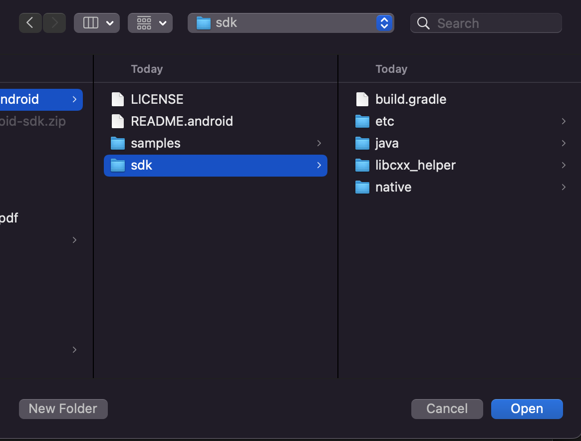 C. 1. 번 에서 다운 받은 Opencv 파일 압출을 푼 상태에서 SDK 폴더를 선택해서 열어줘요.