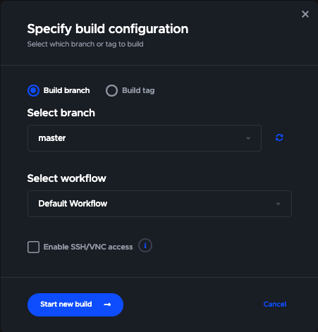 - Codemagic 콘솔에 Start new build를 눌러주세요.