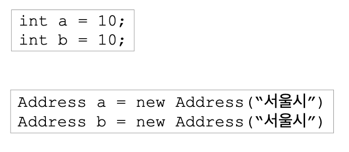 값 타입: 인스턴스가 달라도 그 안에 값이 같으면 같은 것으로 봐야함