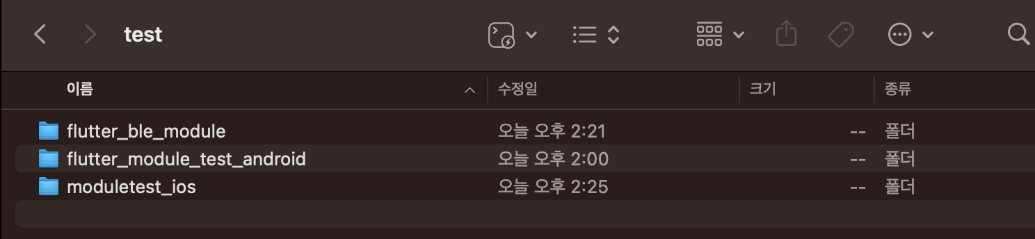 모듈로 생성을 할경우 Flutter clean을 하면 Flutter module 프로젝트의 android, iOS 폴더가 삭제 되기 때문에 중요한 수정 항목이 있다면 백업을 해야 합니다.