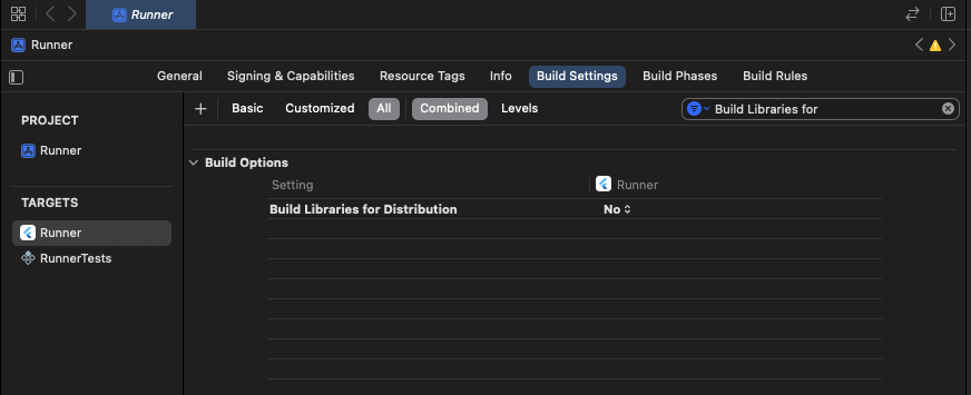 아래와 같이 Build Libraries for Distribution을 No로 수정해 보자 !