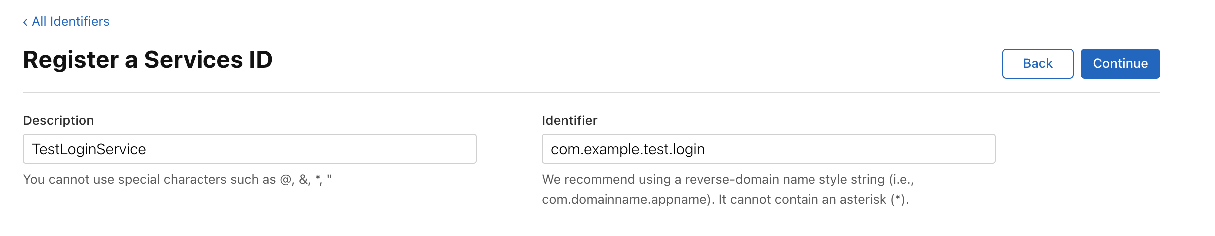 1. identifier 탭에서 + 를 누르고 Service IDs 선택후 Continue