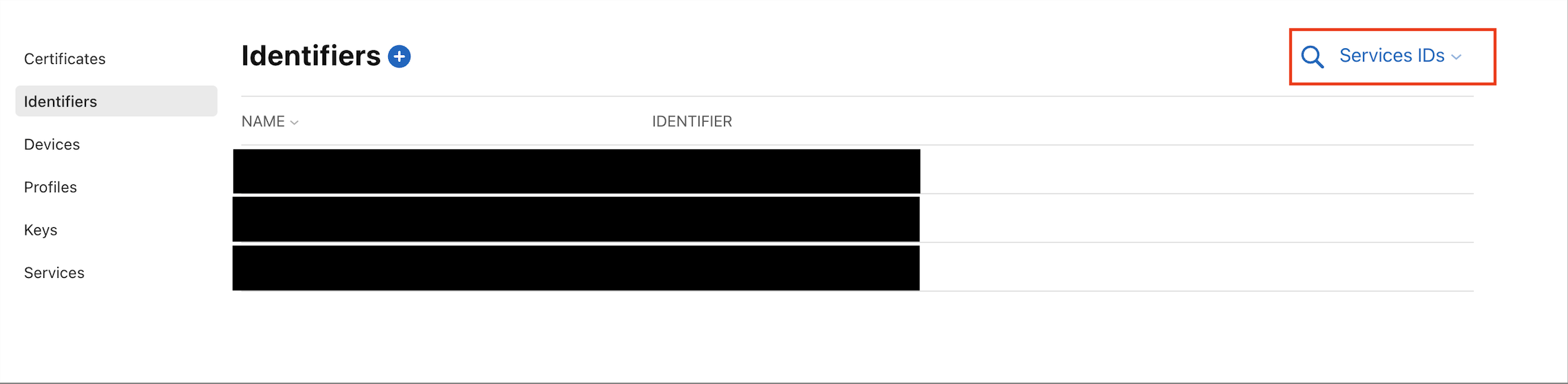 3. 다시 identifiers 탭에서 빨간색 네모 부분은 Services IDs 로 변경하여 2. 번에서 만든 Service id 클릭하여 설정화면 이동