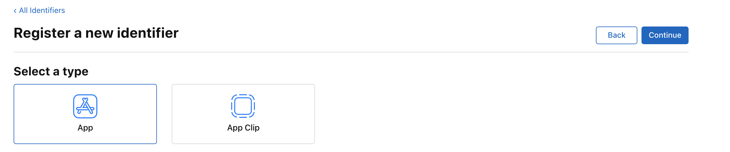 1. identifier 탭에서 + 를 누르고 App IDs 선택후 Continue
