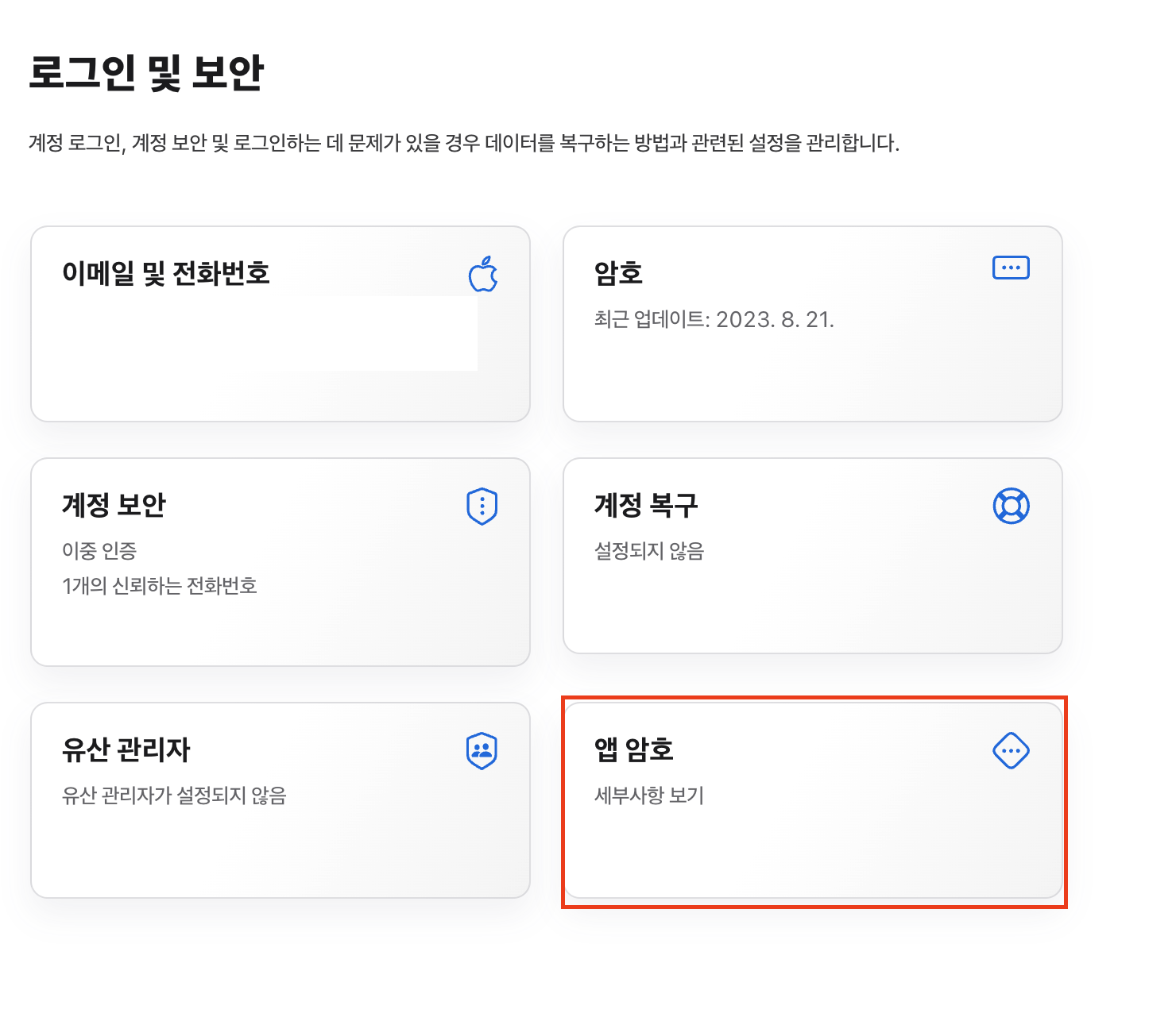 2. 로그인 및 보안 -> 앱 암호 항목을 눌러주세요.