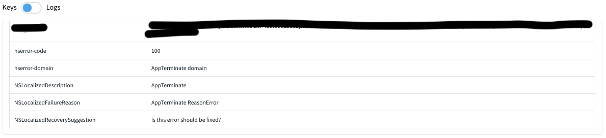 let e = NSError(domain: "applicationWillTerminate", code: 1000, userInfo: userInfo)