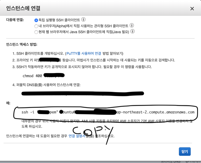 6. 다시 터미널로 이동후 키페어 파일이 존재하는 위치로 가서 복사 해둔 명령어를 실행한다.