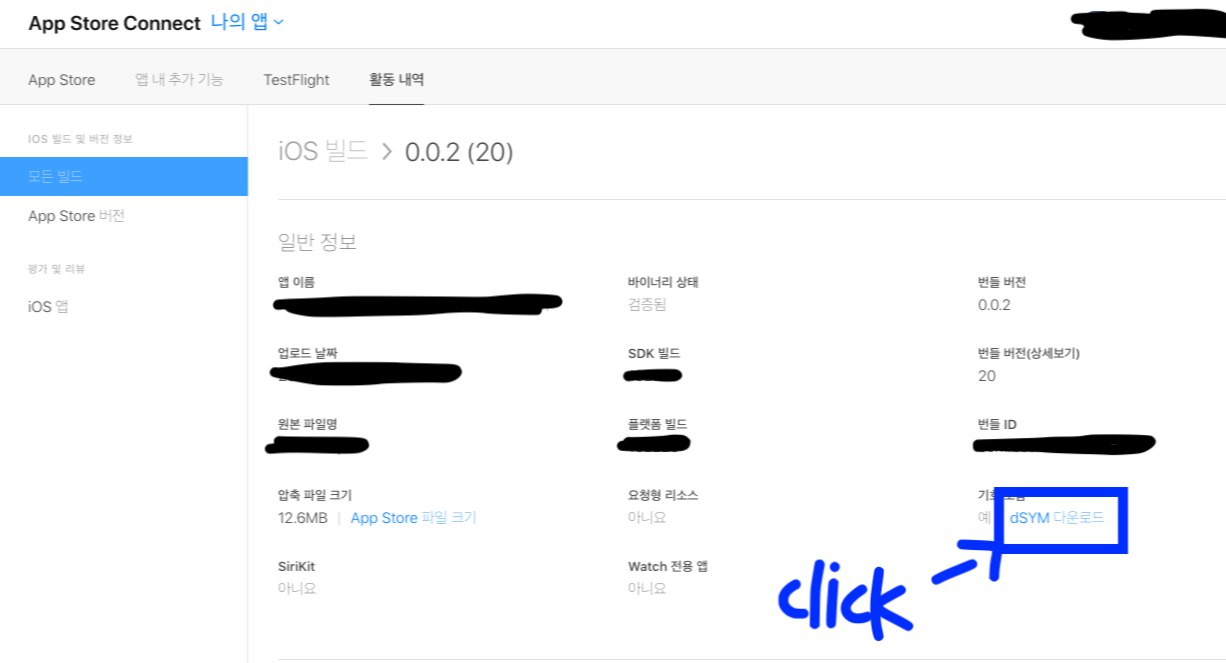 활동 내역 탭 -> 모든 빌드 -> dSYM 다운로드를 클릭하여