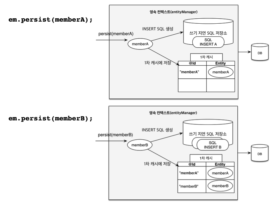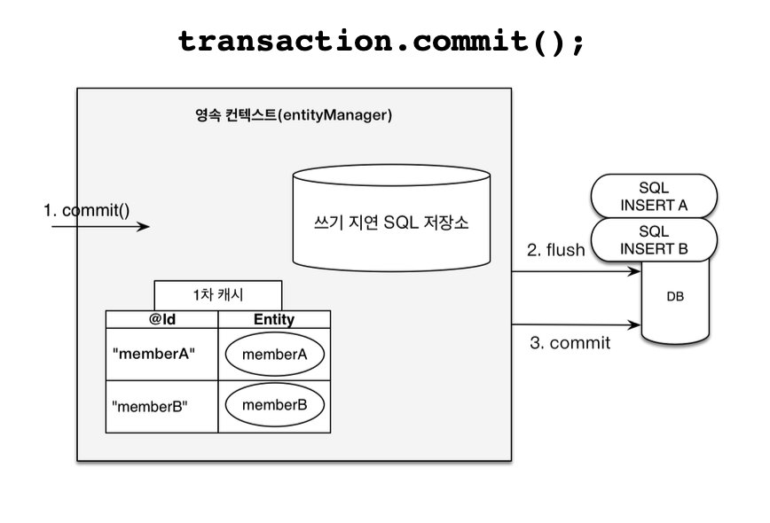 - 쓰기 지연 SQL 저장소의 쿼리를 데이터 베이스에 전송 (등록, 수정, 삭제 쿼리)