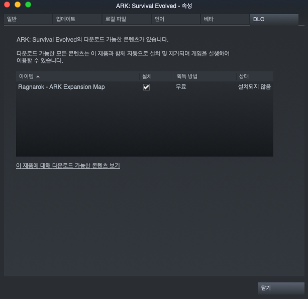 4. DLC 탭에서 아래와같이 라그나로크 맵이 보이고 설치 밑에 체크박스의 체크를 한번 풀었다가 다시 활성화 시켜준다.