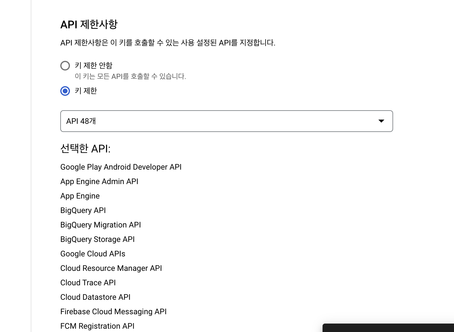 위에 사진을 보면 키 제한 목록에 선택한 API 목록에 Firebase in-app messaging 이 안보일 거예요.