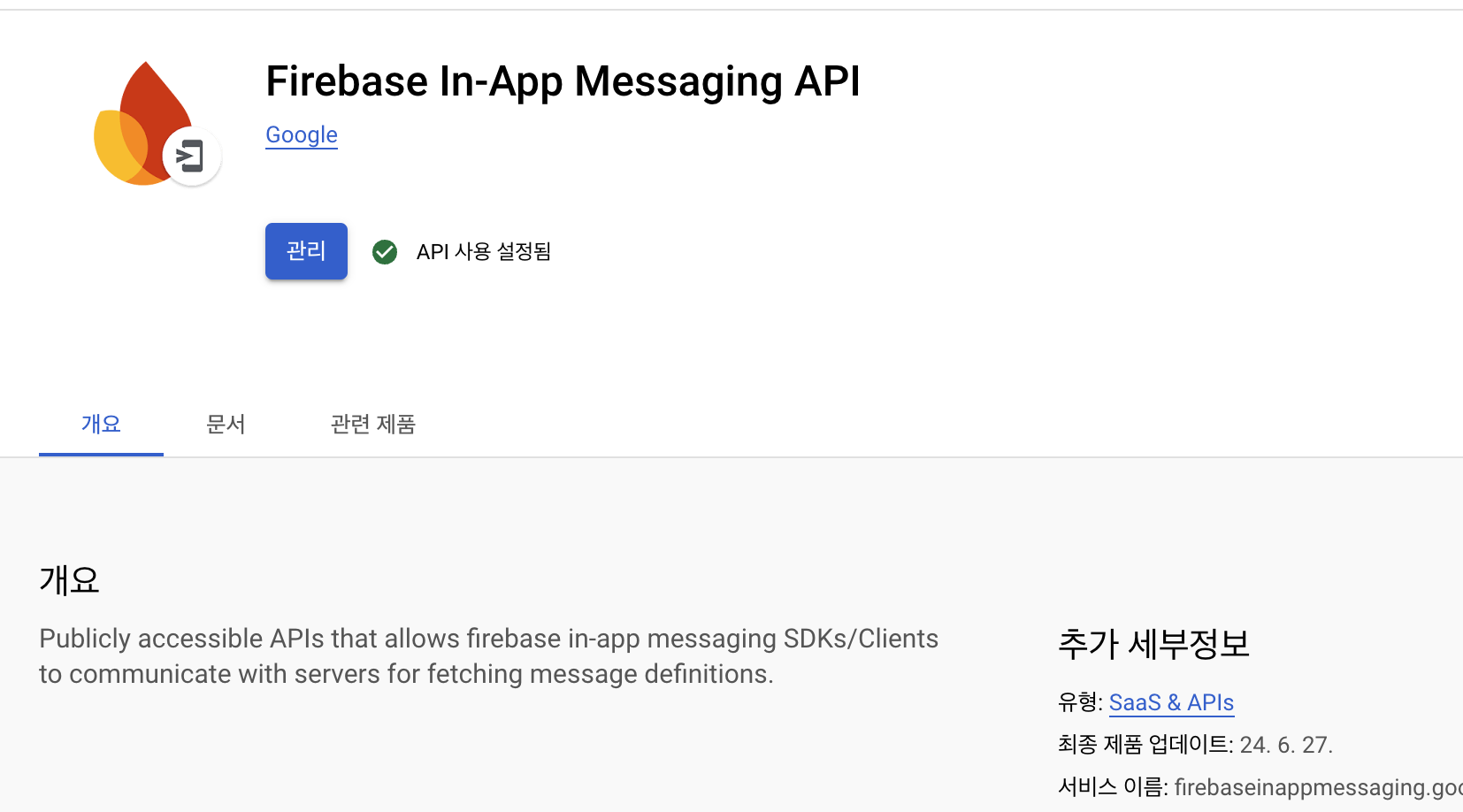 별도로 추가해 주어야 해요. 아래처럼 검색 후 Firebase in-app messaging API 체크를 해주어서 추가해 주세요.
