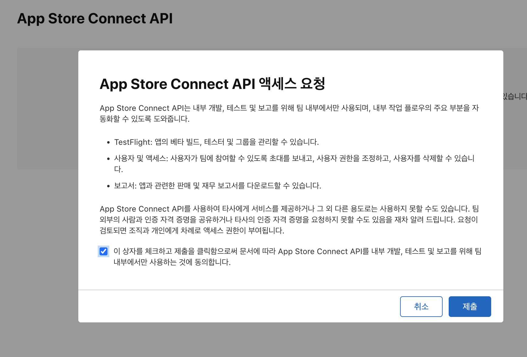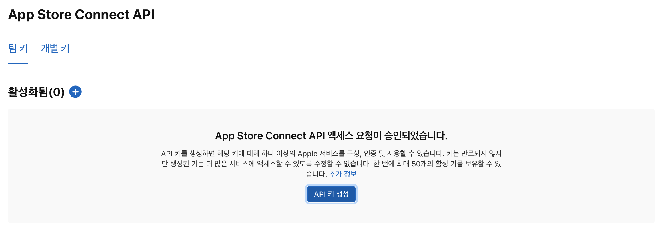 App Store Connect API 엑세스 팀 키 생성 -> API 키 생성 클릭