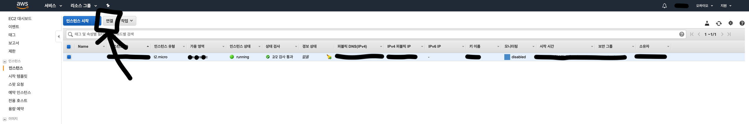 4. aws 인스턴스 콘솔창에서 그림 1 의 연결을 클릭 해준다.